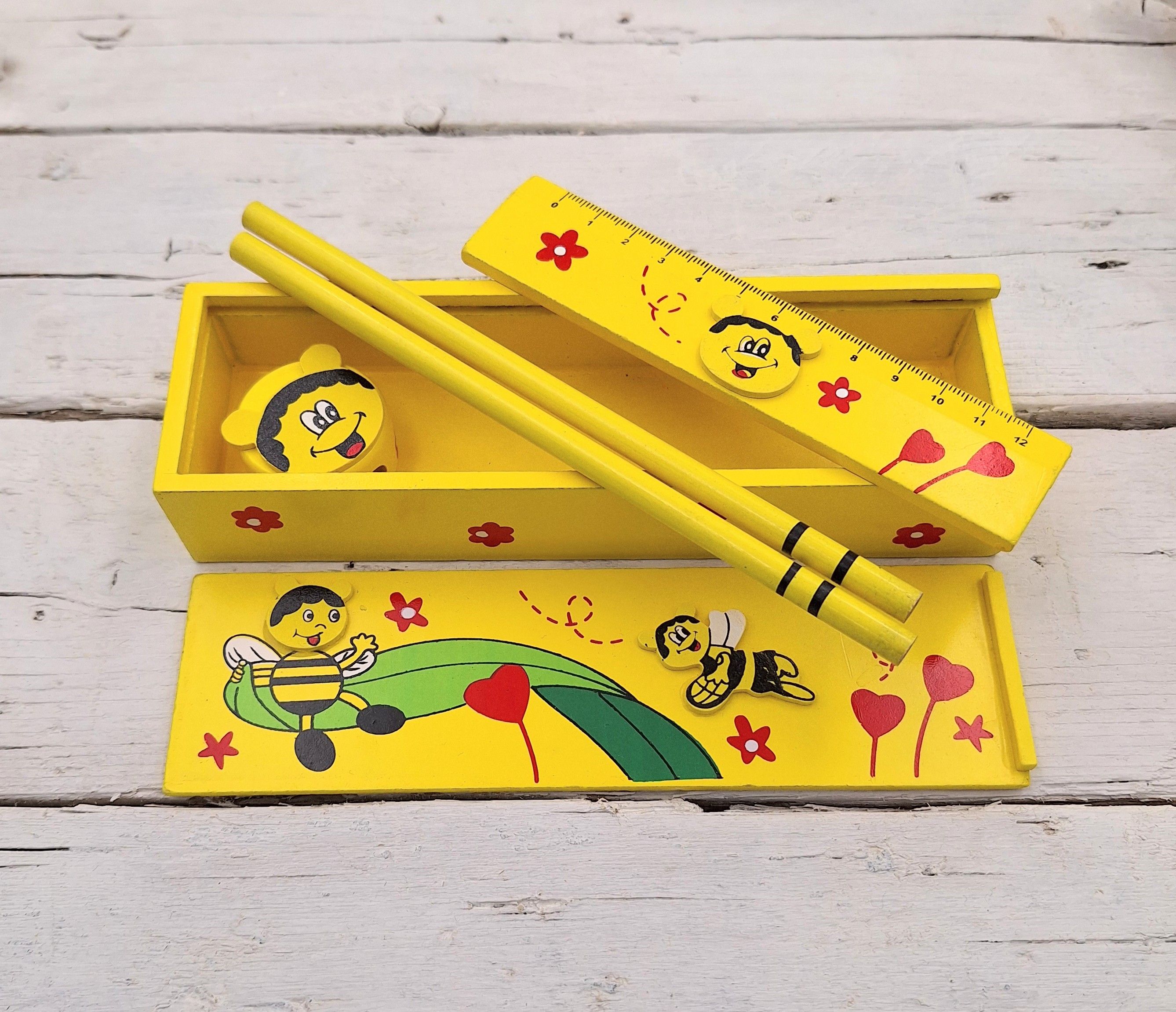 Μπομπονιέρα ξύλινη κασετίνα σε τρία χρώματα, δεμένη με τούλι σατέν κορδέλα και λινό κορδόνι. Η κασετίνα περιέχει δύο μολύβια, ένα χάρακα και μία ξύστρα.